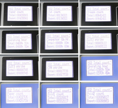 DC-F2 Meters: 381 Operating Hours, 432706 Paper Count, 316817 Fold1 Count, 89817 Fold2 Count.